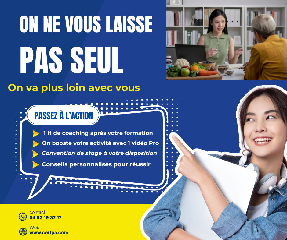 1- A la fin de votre cursus, nous vous offrons 1 heure de coaching avec un coach professionnel pour vous aider à mettre en place votre activité, ( choix du statut, stratégies pour faire évoluer votre cabinet, comment vous faire connaître et développer votre clientèle etc...). Ce qui important pour nous, c'est votre réussite professionnelle et personnelle.