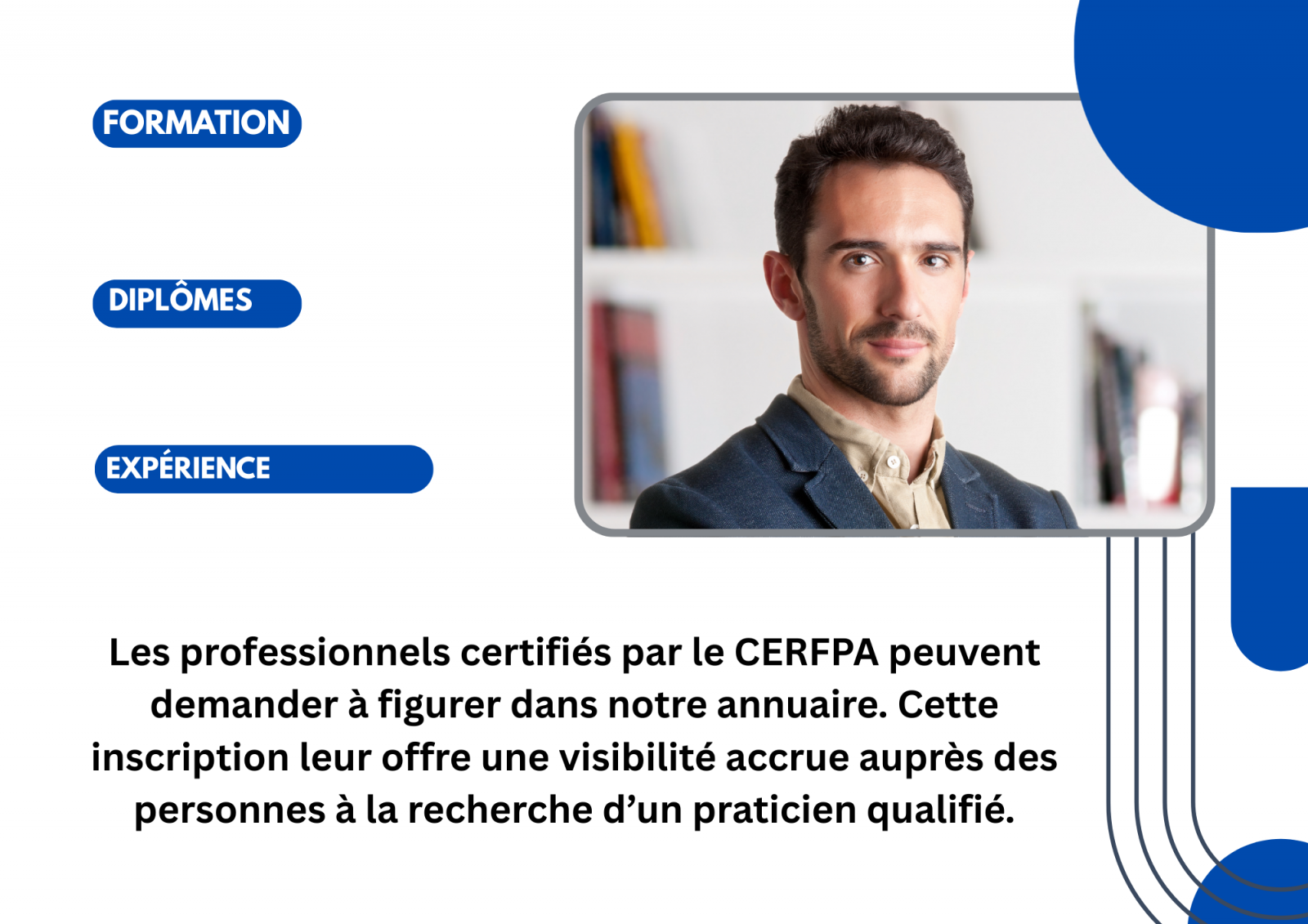 CLAUDE BAUMEL, Fondateur et Directeur du CERFPA : Ph.D - Certifié Neurosciences ( 2020/21 ) - Praticien en PNL et Hypnose Ericksonienne. Formé avec Antony Robbins et le Dr Joe Dispenza et Roger Lannoy au COACHING - Comportementaliste - ( formé à l'école des chiens guides d'aveugles de Provence Côte d'Azur ) - Auteur de Bien Communiquer avec son chien - Ed. De Vecchi - Fondateur du Magazine Clin d'Oeil - Fondateur de SUD EXPO ( organisation de congrés et Salons) - Fondateur de l'association humanitaire clin d'oeil.