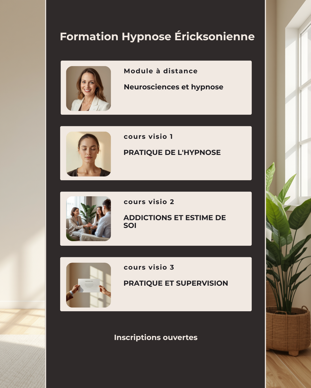 Vous découvrirez des techniques variées telles que les suggestions, les métaphores, et les contes thérapeutiques. Vous aurez également l'opportunité de participer à des stages pratiques en visio pour vous exercer à l'auto-hypnose, apprendre à surmonter les obstacles, gérer les émotions perturbatrices et dépasser certaines limites personnelles.