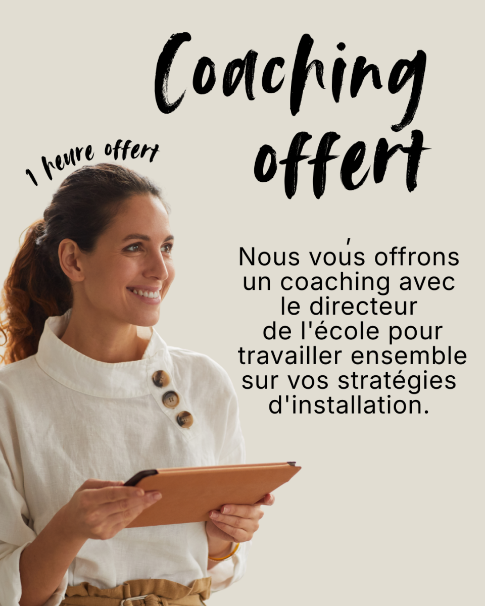 1- A la fin de votre cursus, nous vous offrons 1 heure de coaching avec un coach professionnel pour vous aider à mettre en place votre activité, ( choix du statut, stratégies pour faire évoluer votre cabinet, comment vous faire connaître et développer votre clientèle etc...). Ce qui important pour nous, c'est votre réussite professionnelle et personnelle.